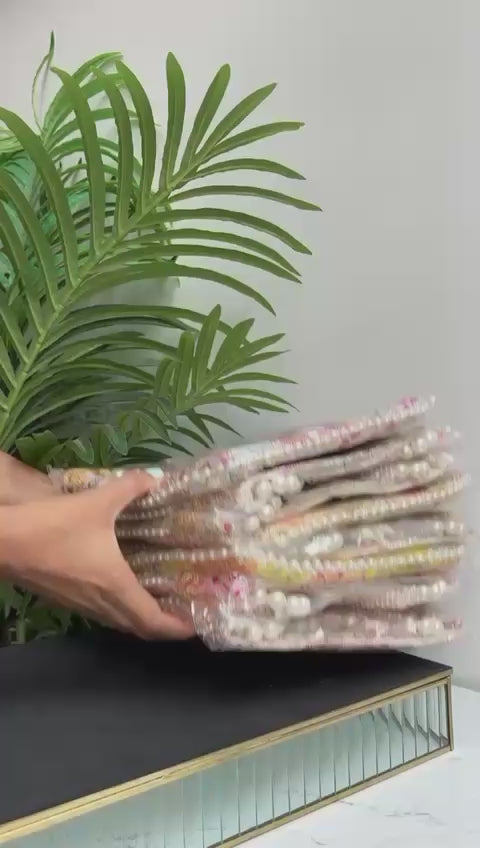 The Heavy Embroidered Multi-Colour Potli features intricate embroidery on both sides, with a pearl handle. Available in mixed colours, perfect for gifting or festive use.