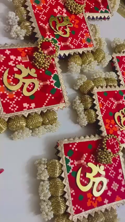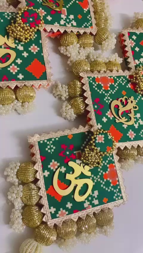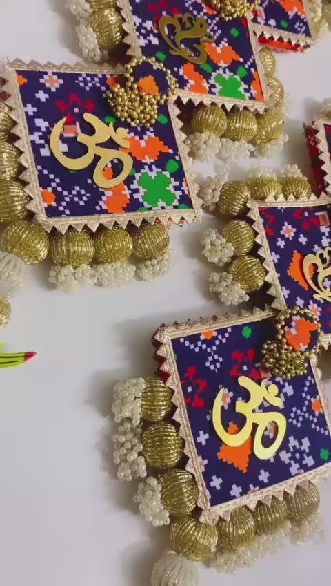 The Premium All-in-One Parrot Hanging Pair features a designer parrot motif with Om, Ganeshji, and Riddhi Siddhi details. Finished with three-sided danglers, cutdana work, rich Patola fabric, and a reversible design, it’s perfect for festive or pooja decor with a timeless look.