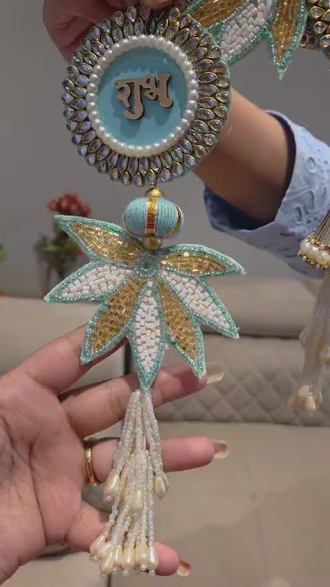 The Pretty & Elegant Beaded Lotus Bandhanwar + Shubh-Labh Set features a beaded lotus design with kundan stone work, pearl danglers, and sequin lace, and comes with a Shubh-Labh accent. Perfect for doorways or pooja spaces with a traditional, festive touch.