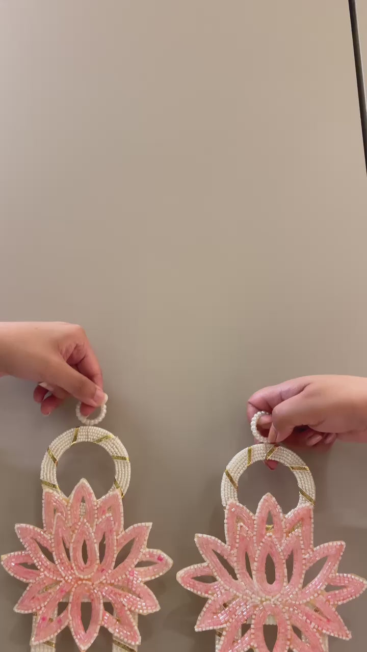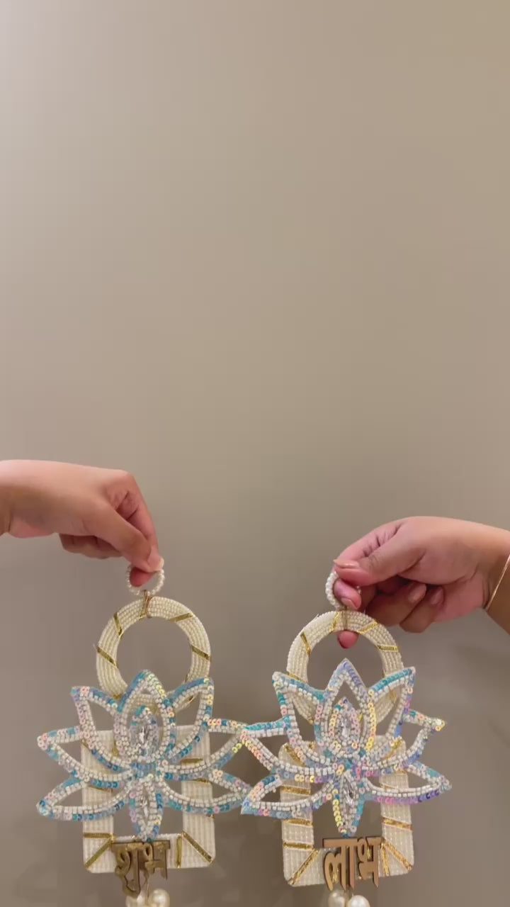 The Pretty Lotus Pearl Dangler Shubh-Labh Hanging Pair features a beaded lotus design with cutdana work and handmade pearl danglers. An eye-catching statement piece, it’s perfect for festive or pooja decor with an elegant finish.