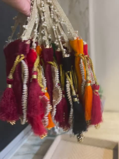 The Regal Elephant Potli features intricate zardosi work on velvet with elephant motifs, a zari lace handle, and heavy tassels. Traditional and elegant, available in mixed colours.